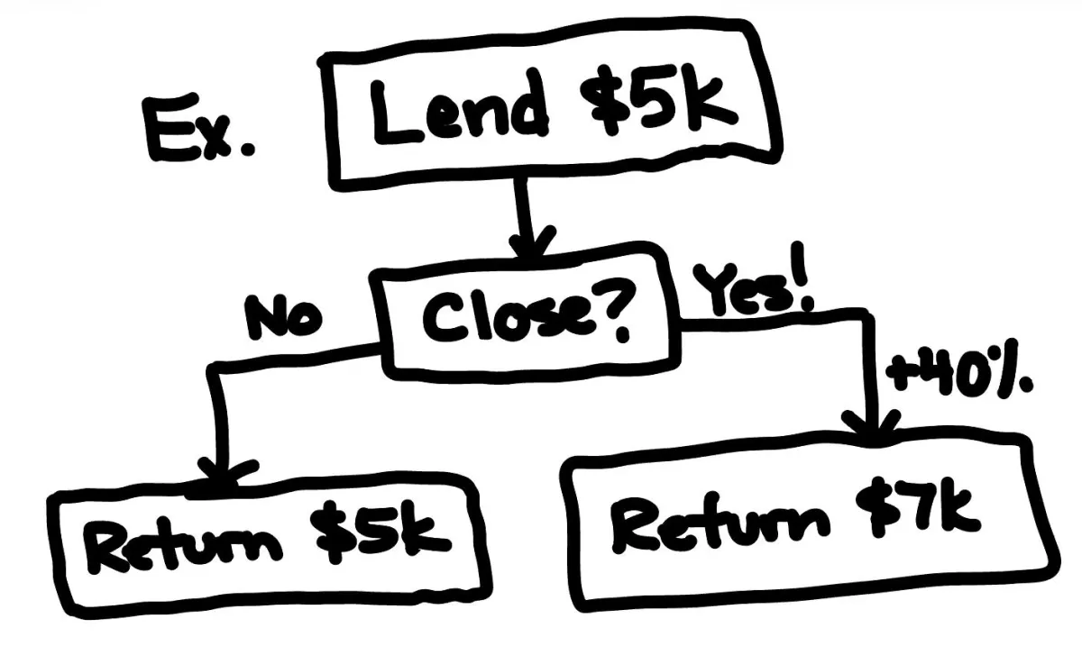 We charge a flat 40% return on all EMD deals with a $1,500 minimum return. That means IF the deal closes, we would receive the initial amount plus 40%. We also charge a minimum $250 non-refundable fee prior to funding your deal to pay our transaction coordinator.